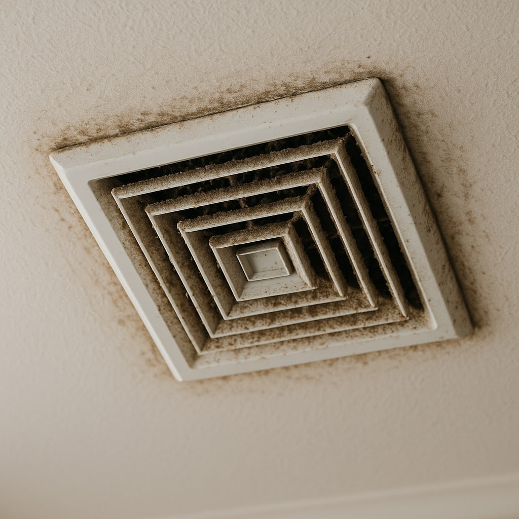 We remove the ceiling grille, vacuum out the dust, lint, and mold, and clean the fan blades and housing.